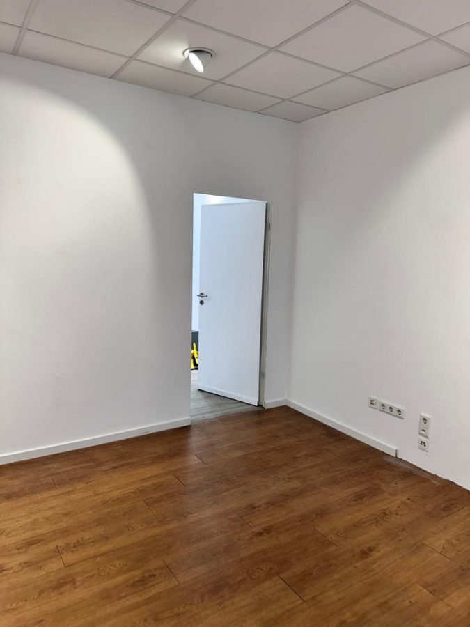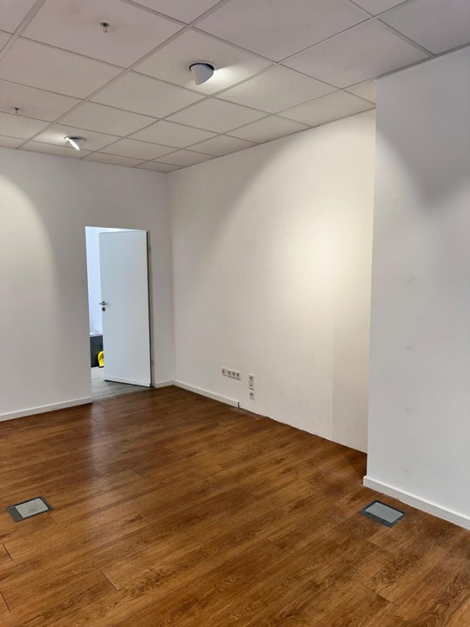 Empfangen werden Sie hier von einem zurzeit als Büro genutzten Zimmer, an diesem liegt das Badezimmer, welches von der dahinter liegenden Gewerbeeinheit mitbenutzt wird.