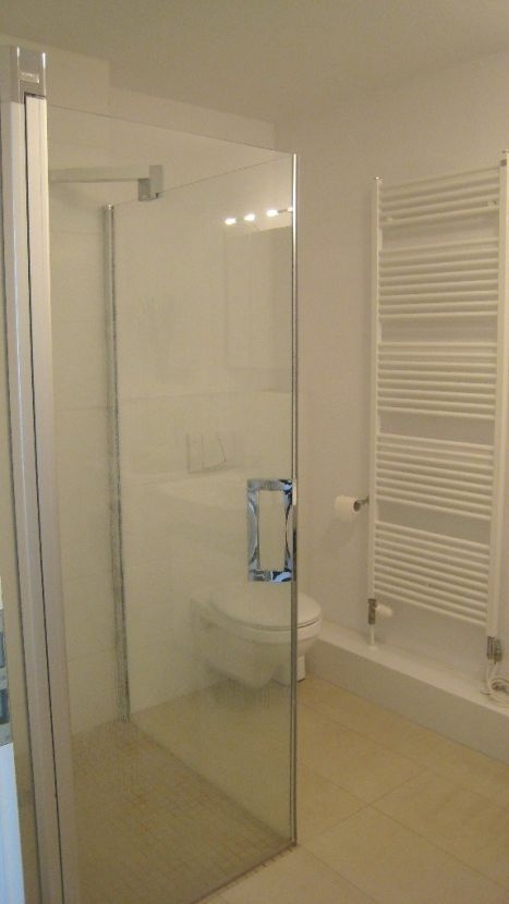 Das großzügige Badezimmer präsentiert sich modern gefliest und verfügt über eine bodengleiche Dusche mit Duschkabine, die Komfort und Stil ideal vereint.